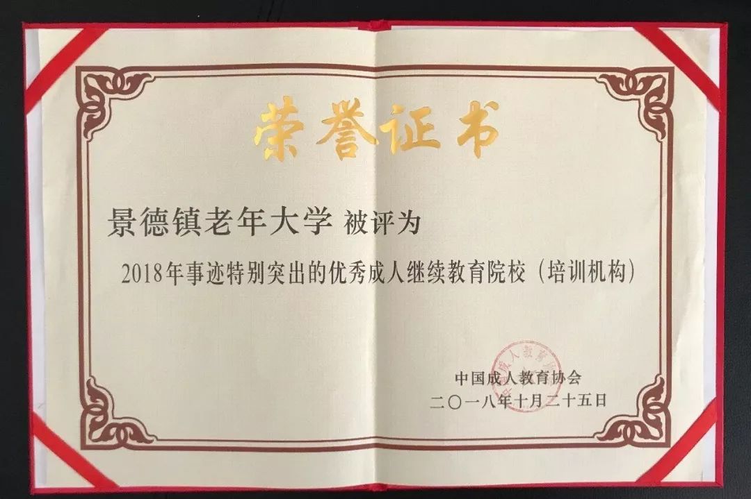 会上,景德镇老年大学等15家单位被评为2018年“事迹特别突出的优秀成人继续教育院校”荣誉称号,并颁发获奖证书。